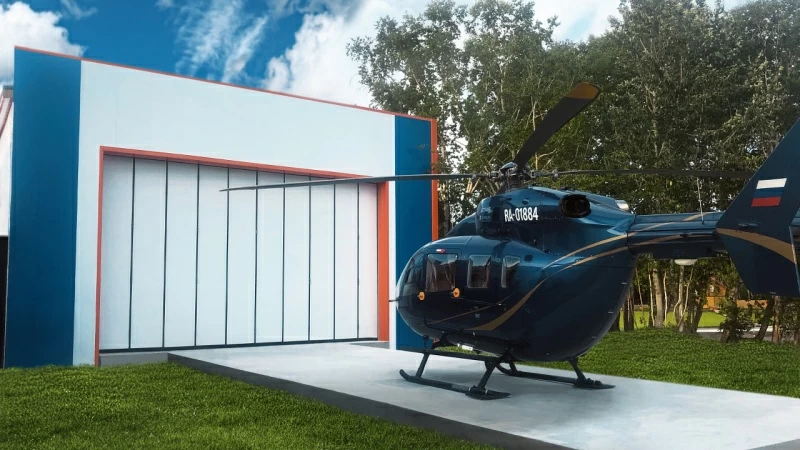 Проектирование и строительство выполнено с учетом сложной сейсмической и климатической зоны. Теплое стационарное здание со складными воротами для хранения и обслуживания вертолетов. Яркий и функциональный дизайн здания, отвечающий всем требованиям Заказчика.